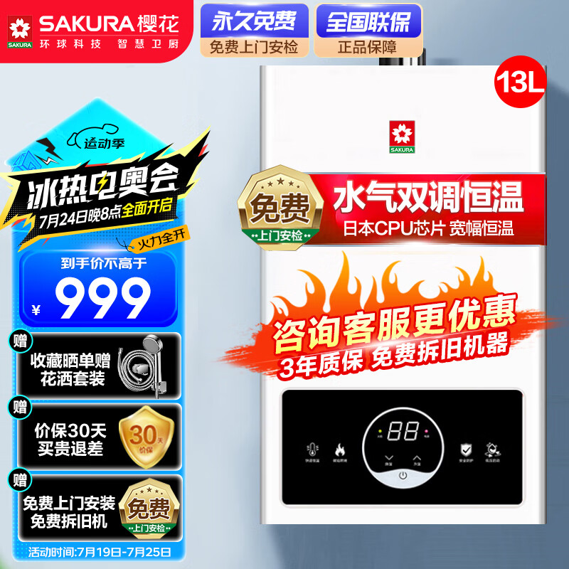 樱花(SAKURA)燃气热水器天然气13升 水气双调 日本CPU 智能精控恒温 低压启动 多重安防 家用 JSQ25-JJP002价格:1199.00元!