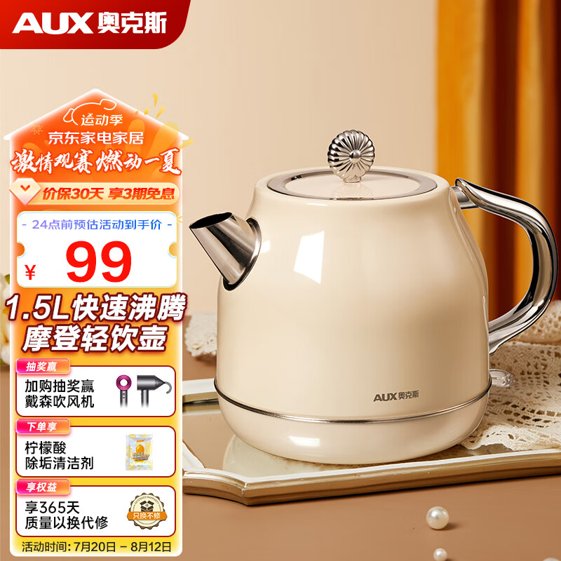 奥克斯(AUX) 电水壶 1.5L大容量家用烧水壶304不锈钢电热水壶复古自动煲水壶 HX-A1519 典雅白 1.5L价格:139.00元!