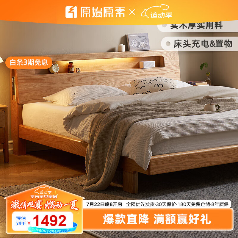 原始原素实木床橡木夜光床现代简约双人床1.5米床低体床原木色双人床价格:2132.00元!