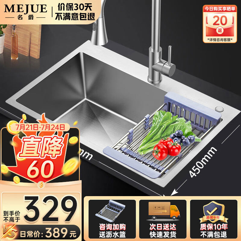 名爵(MEJUE)水槽厨房不锈钢洗碗池洗菜盆一体盆单槽水池手工盆+抽拉龙头2465价格:389.00元!