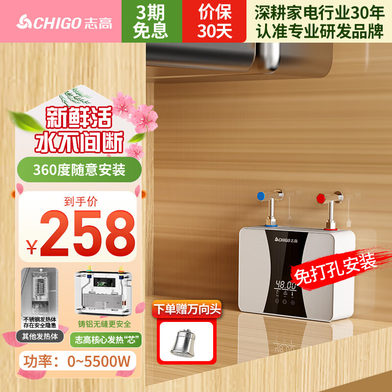 志高(CHIGO)即热式小厨宝5500W 电热水器厨房小尺寸热水器免储水 电热水龙头加热器 过水热 ZG-KB519价格:258.00元!