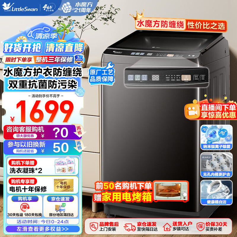 小天鹅(LittleSwan)波轮洗衣机全自动 10公斤大容量 除菌除螨 水魔方护衣防缠绕 TB100V81T价格:1649.00元!
