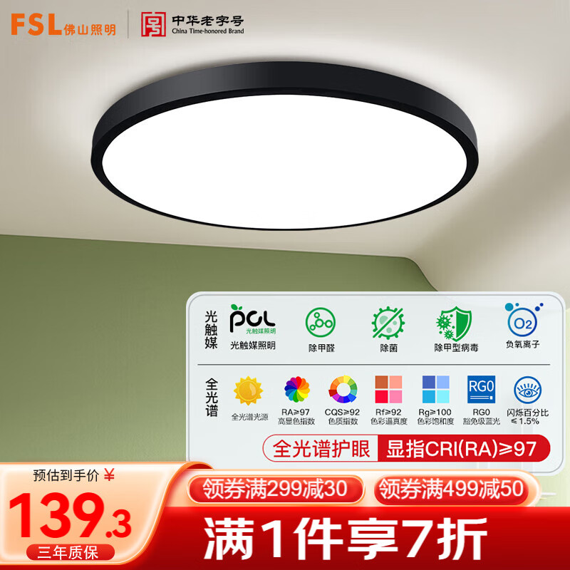 FSL佛山照明全光谱护眼吸顶灯光触媒卧室灯豁免级蓝光Ra97绅士黑25W价格:199.00元!