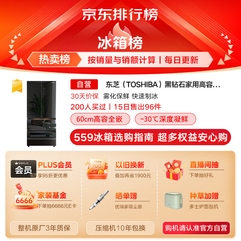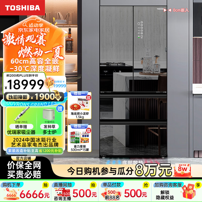 东芝(TOSHIBA)黑钻石家用高容全嵌超薄零嵌法式多门四门镜面自动制冰冰箱一级能效变频GR-RF559WI-PG1B1镜夜黑价格:19998.00元!