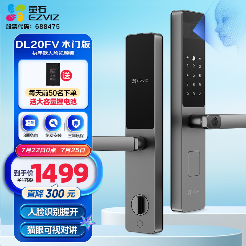萤石DL20FV智能人脸视频锁 木门版标准锁 3D人脸识别指纹握开式视频锁 家用半自动猫眼门铃电子门锁价格:1499.00元!