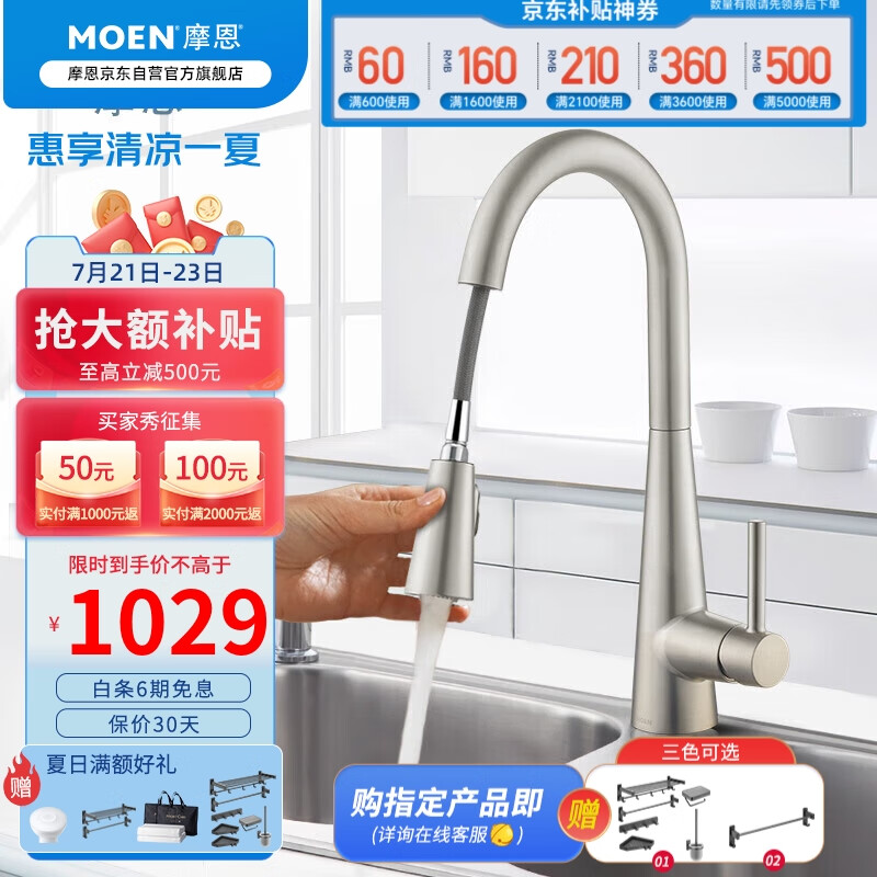 摩恩(MOEN)防指纹拉丝厨房龙头 抽拉式水槽洗菜盆洗碗盆冷热水龙头 59铜龙头价格:1179.00元!