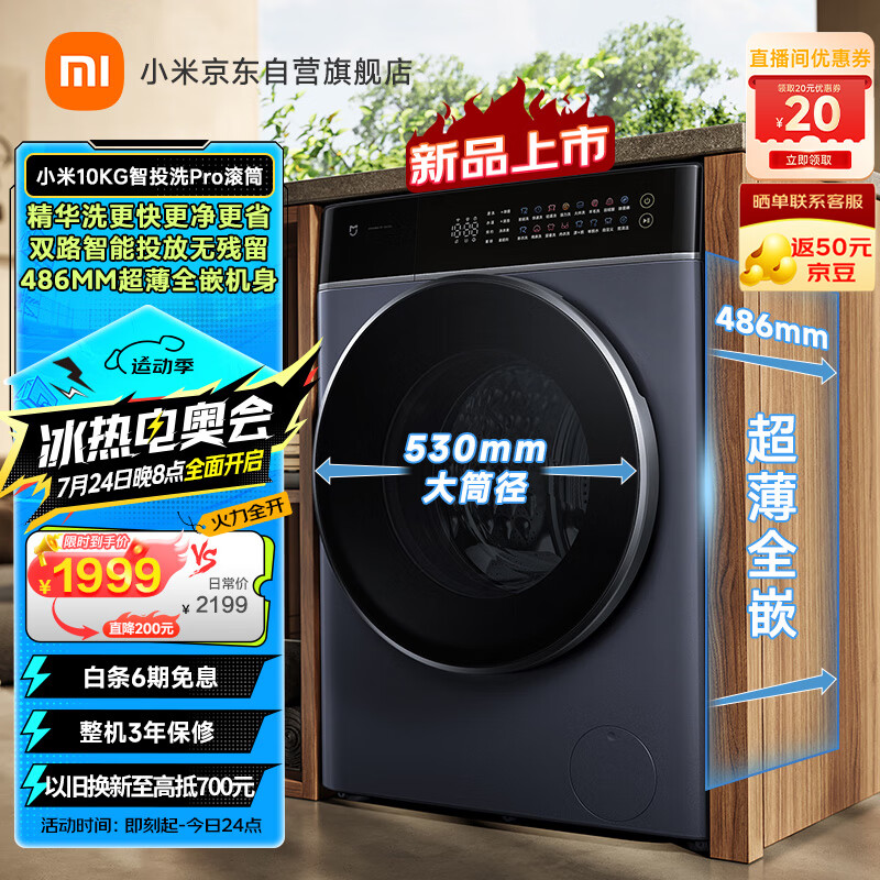 米家小米【精华洗】10公斤智投洗Pro滚筒洗衣机全自动 超薄全嵌大筒径 1.1高洗净比 XQG100MJ303价格:1999.00元!