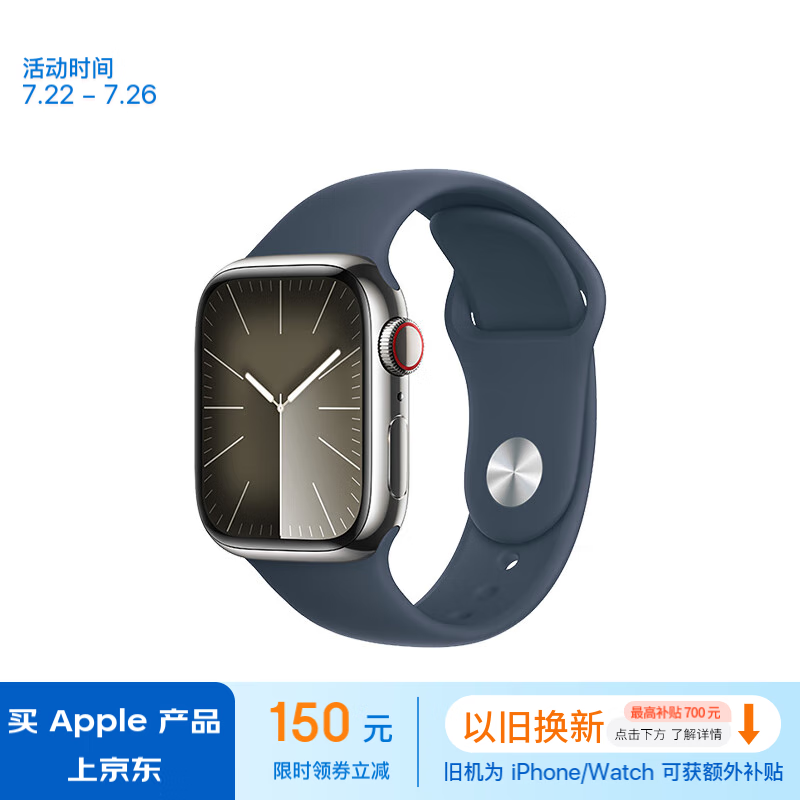 Apple/苹果 Watch Series 9 智能手表GPS+蜂窝款41毫米银色不锈钢表壳风暴蓝色运动型表带S/M MRJT3CH/A价格:5799.00元!