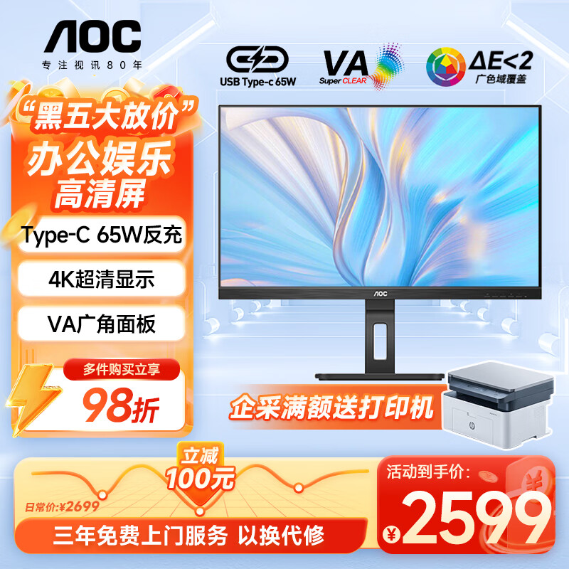 AOC31.5英寸4K type-c 65W反向充电 窄边框 旋转升降 低蓝光不闪屏 专业设计商务办公显示器U32P2C价格:2599.00元!
