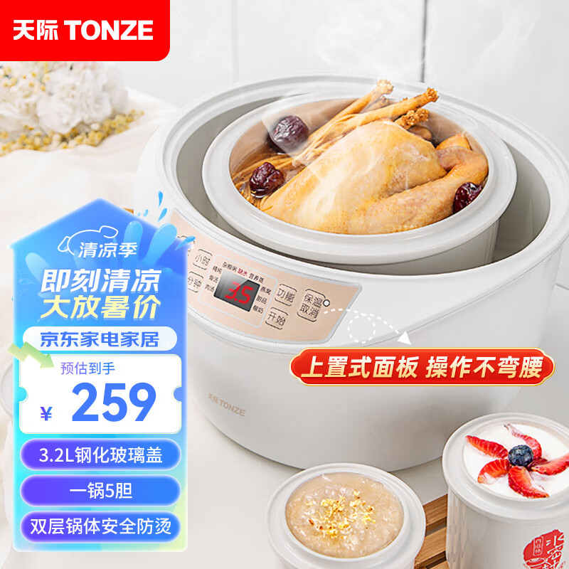 天际(TONZE)电炖锅 电炖盅 隔水炖锅 煲汤锅炖汤锅 熬粥燕窝养生锅 智能预约 白瓷5胆 DGD32-W132B 3.2L价格:259.00元!