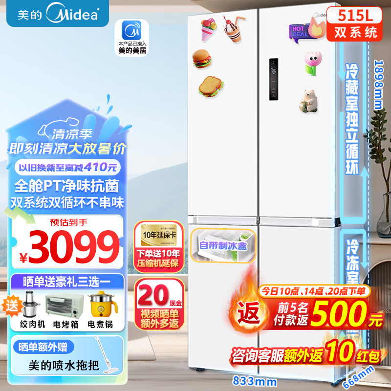 美的(Midea)540双系统双循环十字对开门四开门全舱PT净味冰箱变频一级能效大容量风冷无霜电冰箱MR-540WSPZE价格:3799.00元!