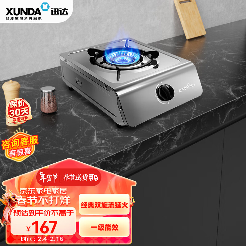 迅达(XUNDA)燃气灶液化气灶家用 台式煤气灶单灶具 旋流猛火炉灶 不锈钢面板 66%热效率 T1-液化气价格:167.00元!