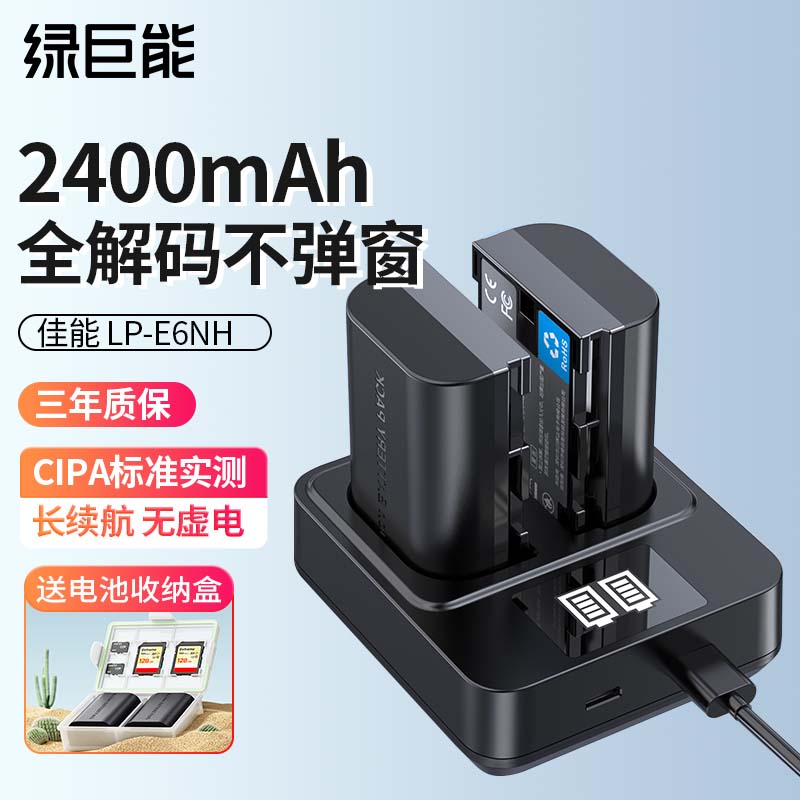 绿巨能(llano)佳能LP-E6NH相机电池R6电池充电器5D4/90d/5d3/R5/80d/70d/60d/6D2单反相机电池套装2400mAh价格:369.00元!