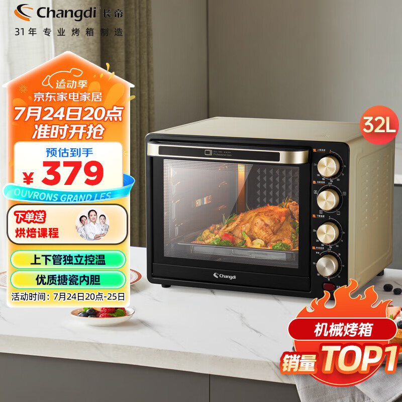长帝(changdi)家用多功能电烤箱 32升大容量 搪瓷内胆 上下管独立控温 广域调温 机械式旋钮操控价格:379.00元!