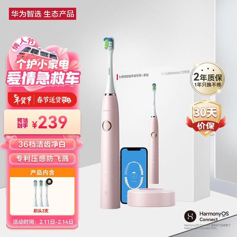 华为智选力博得电动牙刷 智能声波牙刷成人情侣款 星钻 樱雪粉 牙医推荐 新年礼物 情人节礼物送女友价格:282.00元!