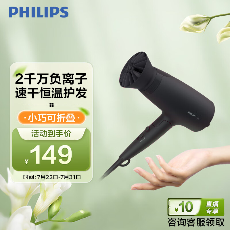 飞利浦(PHILIPS)电吹风机 3系小花筒 低温速干大功率 负离子护发 小花筒 黑色 可折叠家用价格:149.00元!
