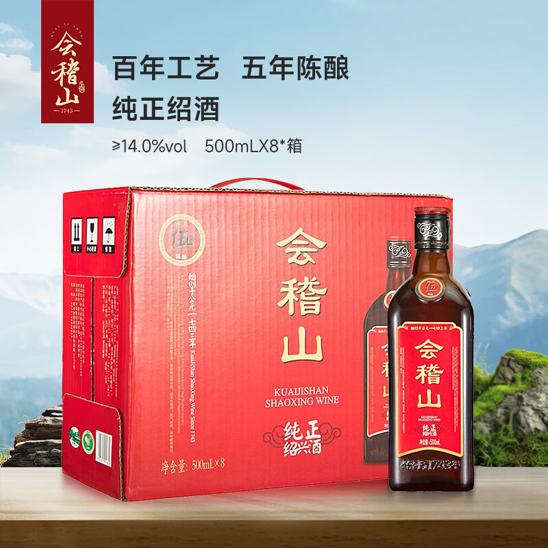 会稽山 纯正五年 传统型半干 绍兴 黄酒 500ml*8瓶 整箱装价格:176.00元!