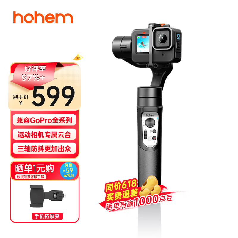 浩瀚(hohem)Pro4 运动相机手持云台稳定器 适用GoPro12/11/10/9/8/7/6/5/4 三轴防抖云台价格:599.00元!