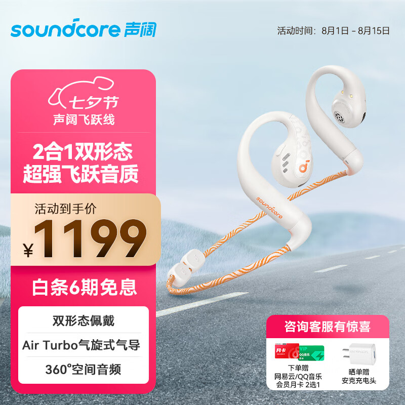 声阔飞跃线2合1不入耳蓝牙耳机AeroFit Pro开放舒适音质颠覆骨传导无线运动跑步适用苹果华为手机白价格:1199.00元!