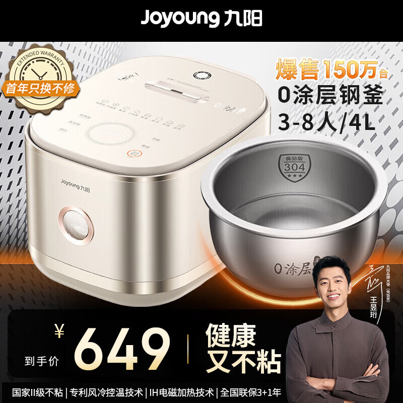 九阳(Joyoung)【2代0涂层】4升3-8人无涂层电饭煲饭锅IH加热超硬化304不锈钢内胆年货40N1S太空系列春晚合作价格:649.00元!
