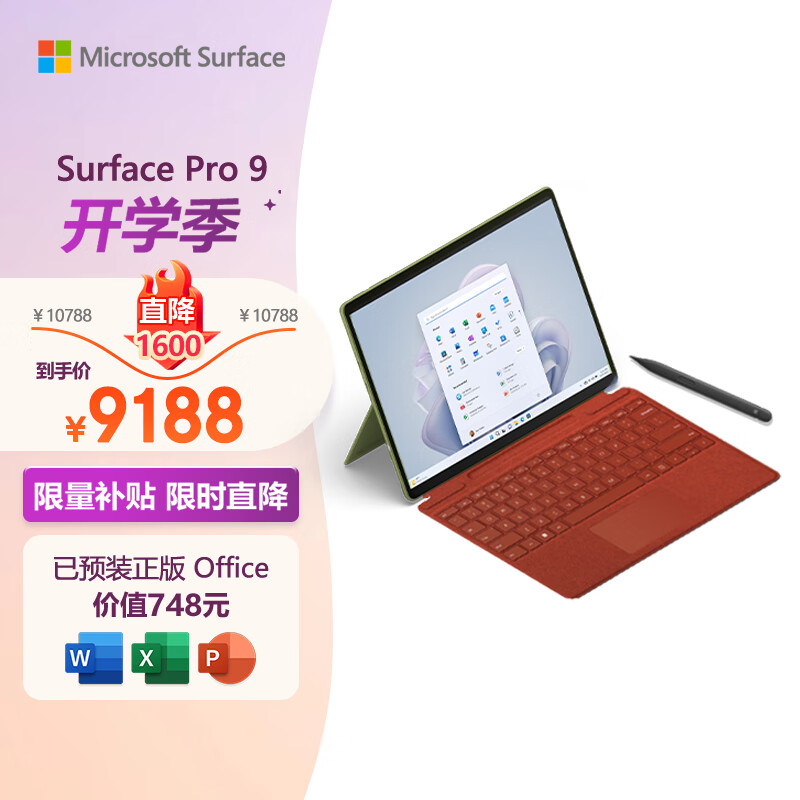 微软Surface Pro 9森野绿+波比红带触控笔键盘盖i5 8G+256G 二合一学生平板 13英寸120Hz屏 笔记本电脑价格:9188.00元!