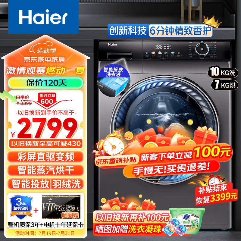 海尔洗衣机全自动10KG直驱变频滚筒洗衣机 家用大容量洗烘一体机智能投放 羽绒洗 顽渍洗价格:3399.00元!