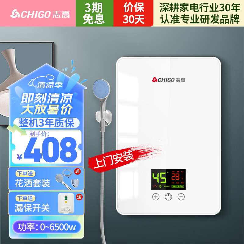 志高(CHIGO)即热式电热水器超薄小厨宝6500W变频恒温智能省电出租房家用洗澡免储水 包安装带漏保ZG-KB626价格:408.00元!