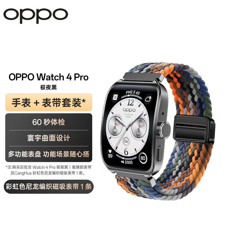 OPPO Watch 4 Pro 极夜黑 全智能手表 男女运动手表 智能健康eSIM电话手表+彩虹色尼龙编织表带套装价格:2342.00元!