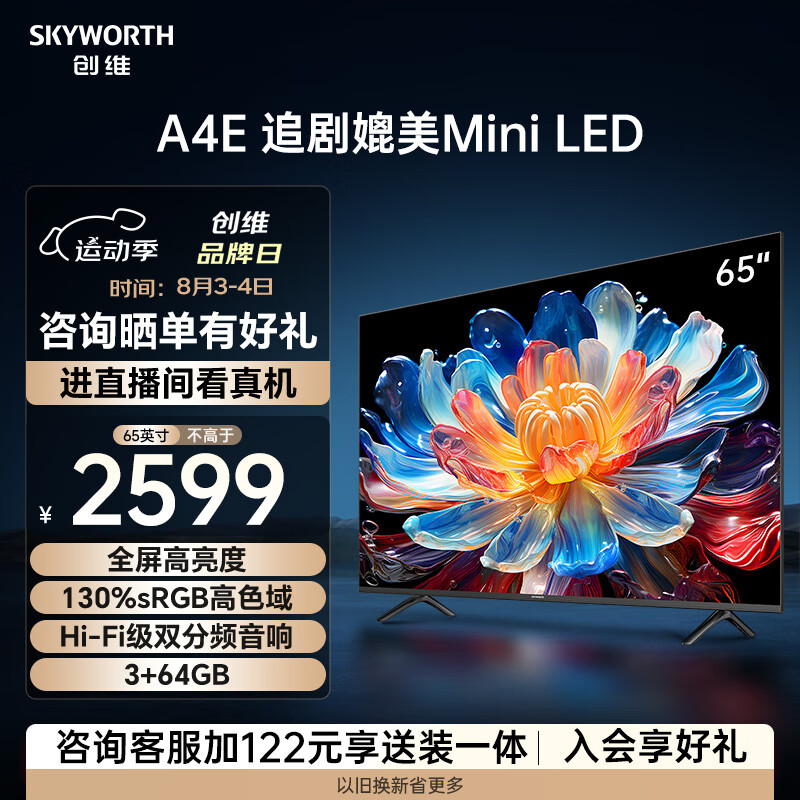 创维电视65A4E 65英寸媲美mini led 十电视机双分频音响3+64G智慧屏液晶4K超薄游戏电视价格:2599.00元!