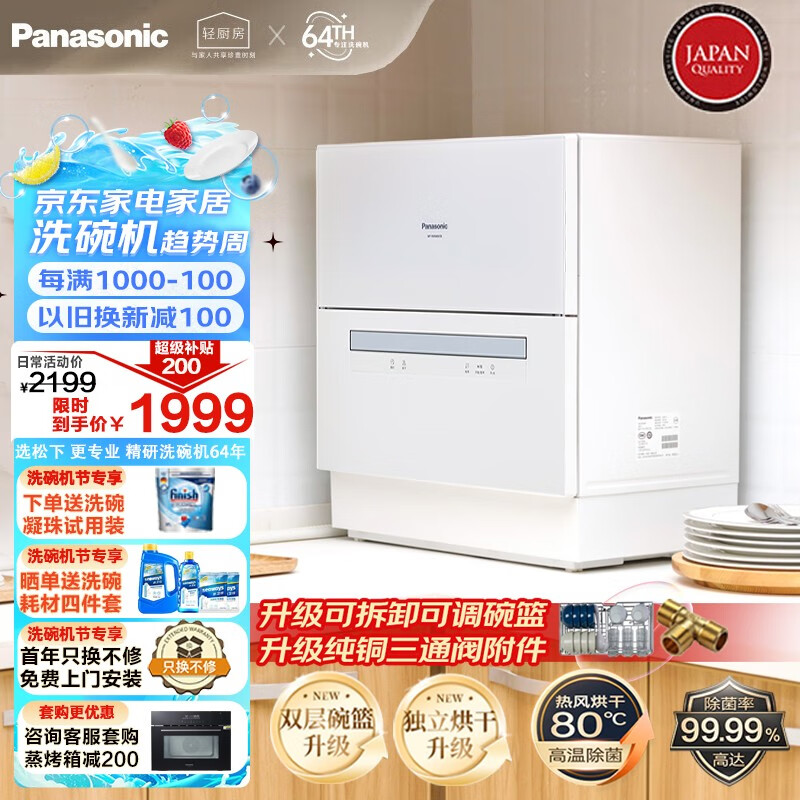 松下(Panasonic)台式洗碗机 软化水系统 80℃高温除菌 洗烘一体 热风烘干 易安装家用刷碗机 NP-K8RAH1D(蓝色)价格:1999.00元!