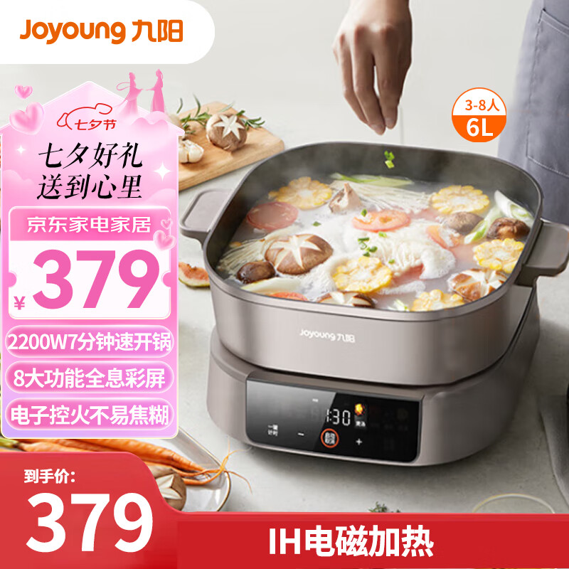 九阳(Joyoung)电火锅IH秒涮电磁加热2200W大火力电热锅多功能锅6L烤涮分体式电炒锅电煮锅全息触控大彩屏HG60-G2价格:379.00元!