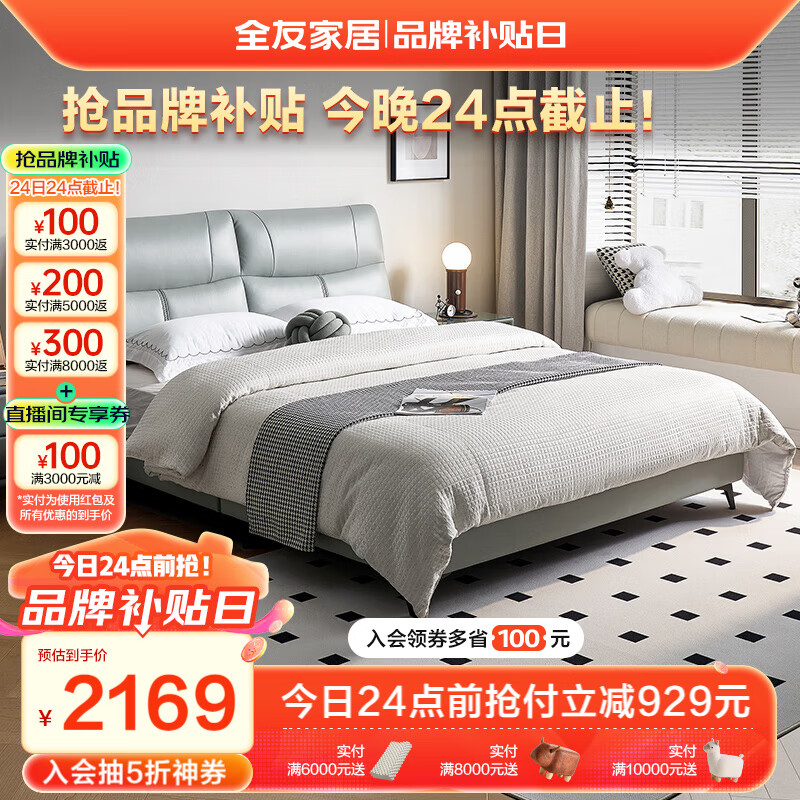 全友家居 真皮艺床现代轻奢主卧室头层牛皮双人大床1.8x2米家具105201价格:3098.57元!