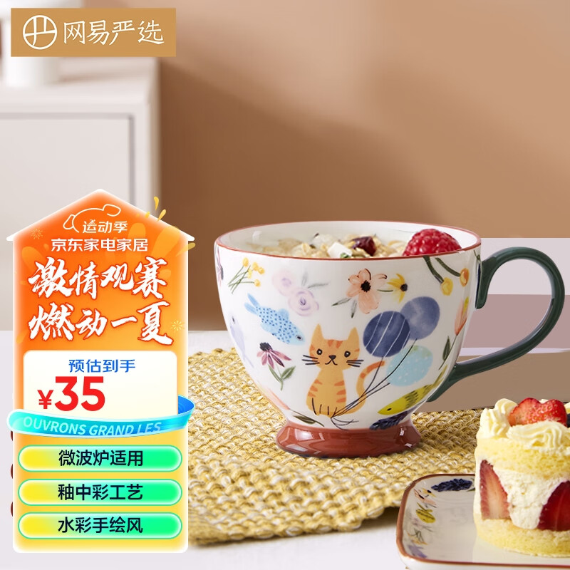 网易严选 田园手绘早餐杯水杯杯子 微波炉适用陶瓷马克杯 猫咪派对400ml价格:38.00元!
