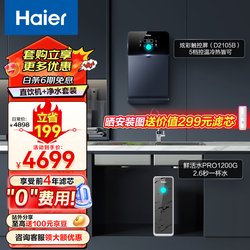 海尔(Haier)直饮加热净水器1200G鲜活水 pro家用净水机6年RO反渗透净水器+管线机套装HKC3000-R793D2U1+D2105B价格:4699.00元!