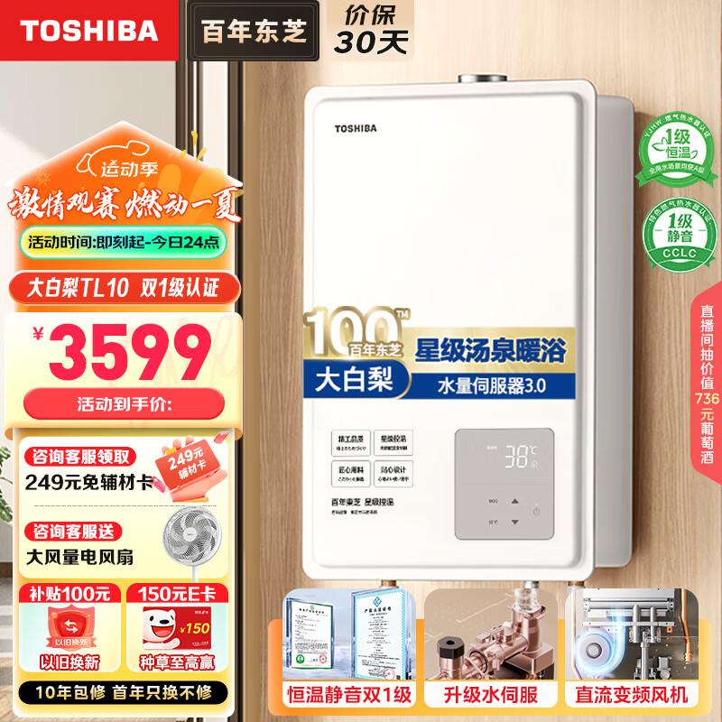 东芝(TOSHIBA)16升燃气热水器 大白梨 一级静音一级恒温 水伺服 变频下置风机 天然气家用强排式 TL10价格:3899.00元!
