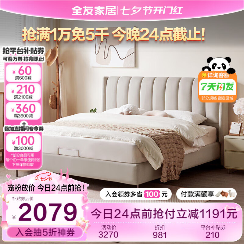 全友家居 床现代简约科技布床双人床主卧室1.8米舒适软靠家具105207CK价格:3270.00元!