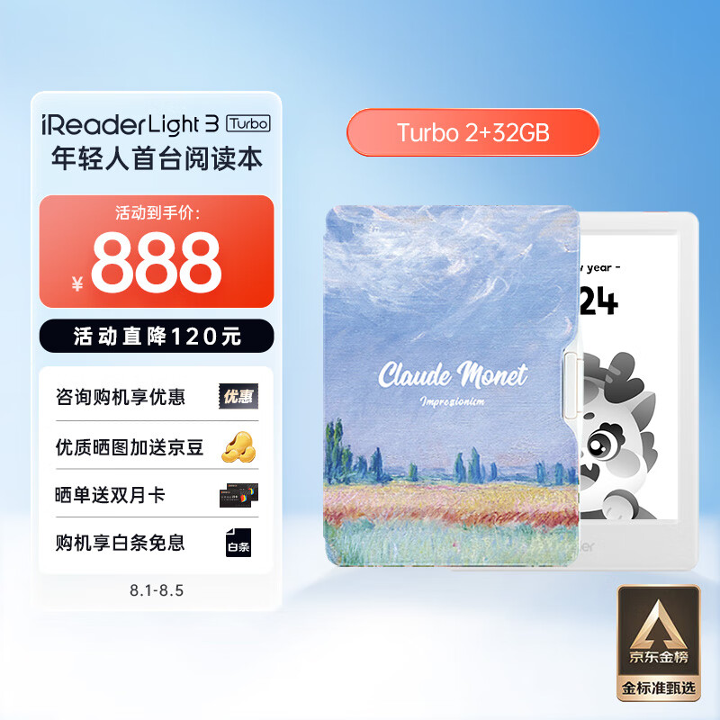 掌阅iReader Light3 Turbo智能阅读本 电子书阅读器 6英寸墨水屏电纸书 32G 告白 莫奈稻田·翻页键套装价格:888.00元!