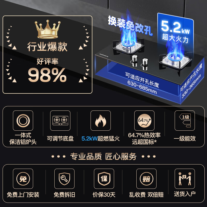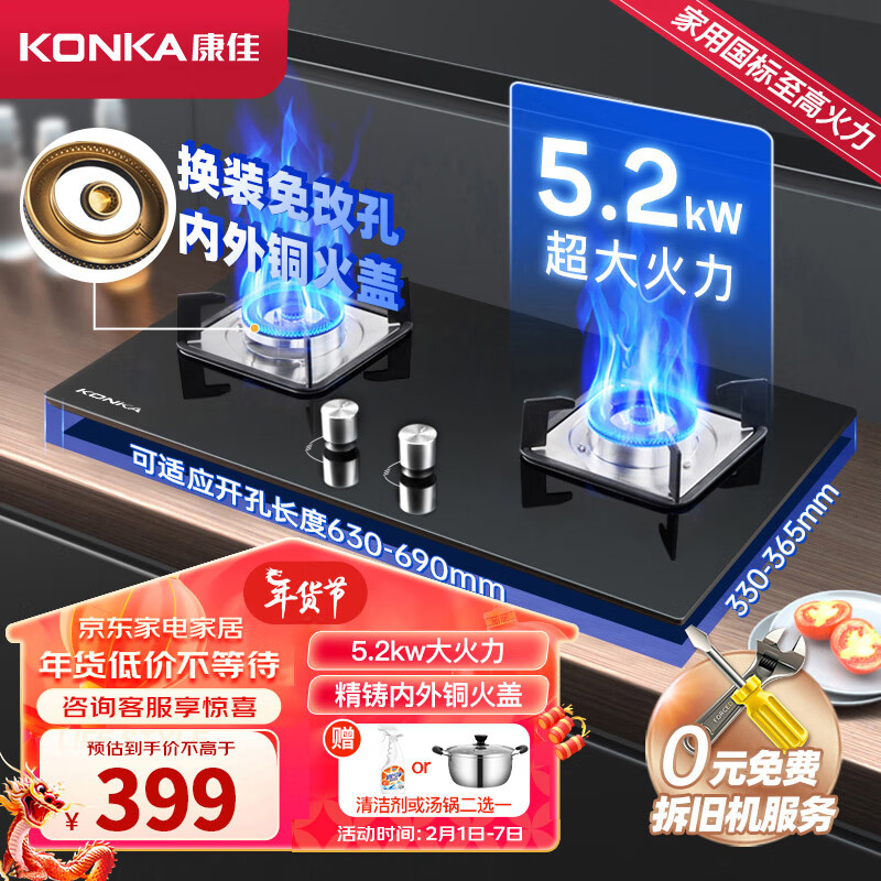 康佳(KONKA)燃气灶双灶具 5.2kW猛火灶 台式/嵌入式 兼容性底盘免扩孔 铜火盖铝炉头 JZT-B500F(天然气)价格:429.00元!