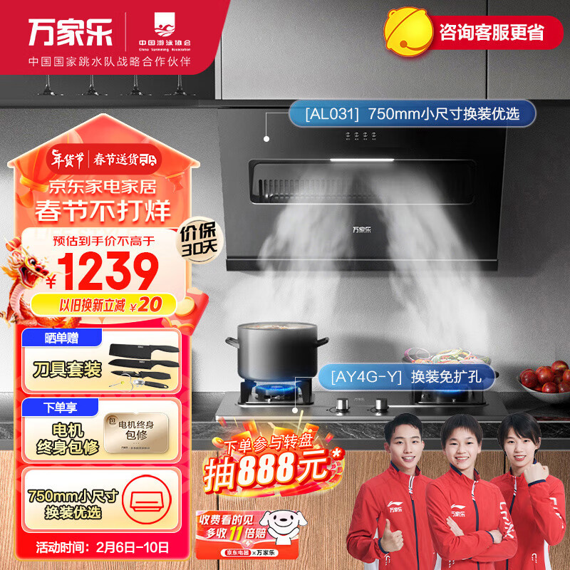 万家乐抽油烟机 18立方小尺大吸力油烟机?家用换新免扩孔4.5kw不锈钢煤气灶具套装AL031+AY4G液化气价格:1539.00元!