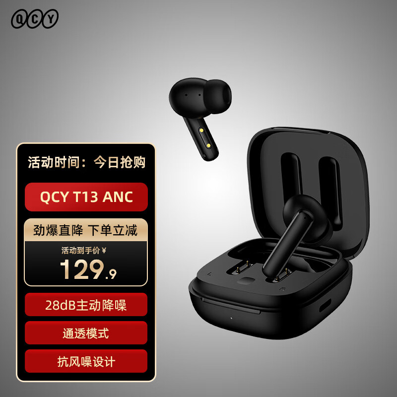 QCY T13 ANC 真无线蓝牙耳机 主动降噪款 运动耳麦 主从切换4麦通话降噪 耳机快充 全手机通用 黑色价格:109.90元!