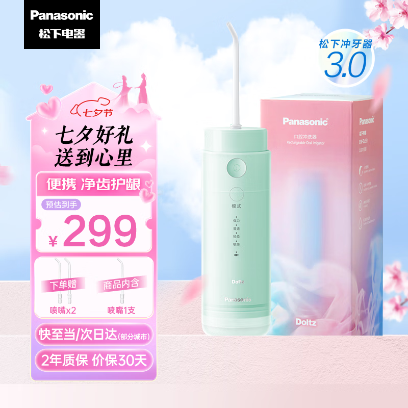 松下(Panasonic)冲牙器洗牙器水牙线 高频脉冲水流小巧便携伸缩小圆管情侣七夕情人礼物送男友送女友DJ33青柠绿价格:314.00元!