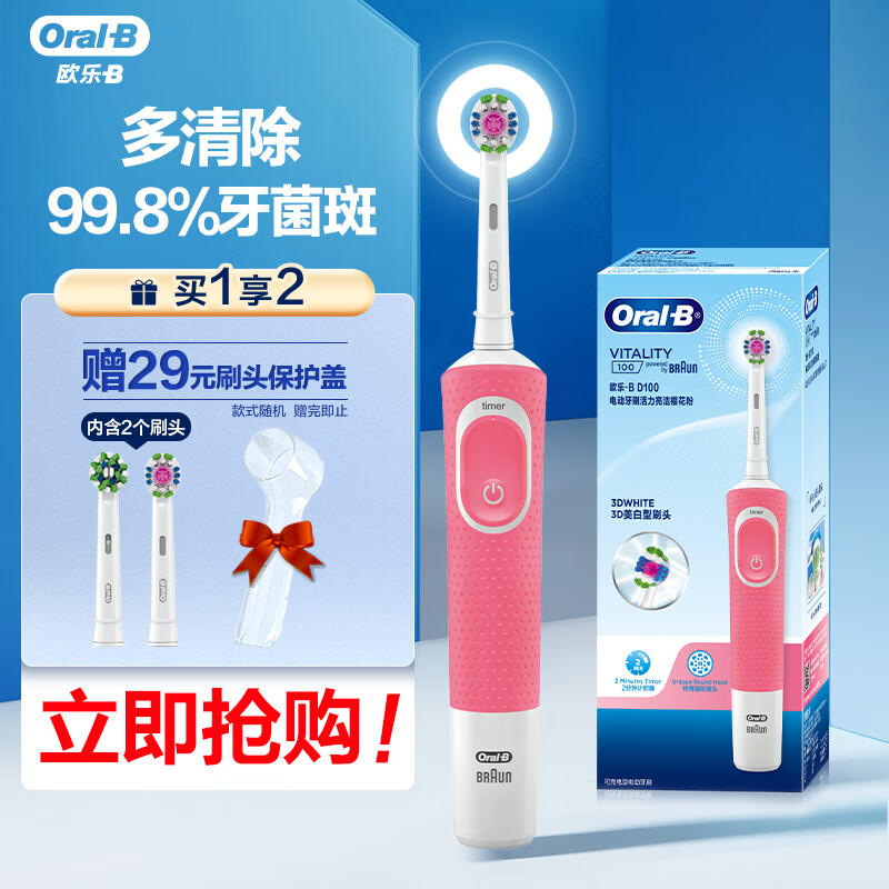 欧乐B电动牙刷成人 圆头牙刷自动声波旋转震动充电式(含刷头*2)日常清洁 樱花粉D100博朗精工新年礼物价格:189.00元!