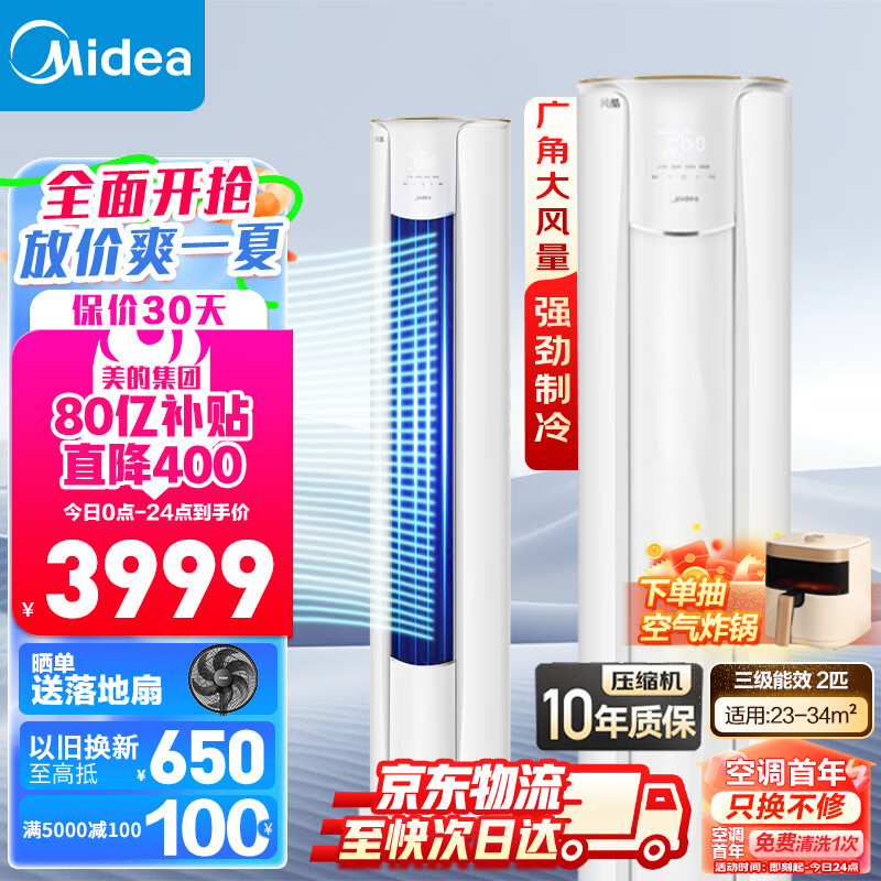 美的(Midea)空调2匹 风酷三级能效 变频冷暖 客厅空调立式 空调柜机 京东小家智能 KFR-51LW/N8MJC3价格:3999.00元!