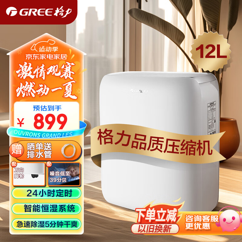 格力(GREE)抽湿机/除湿机 除湿量12升/天 家用轻音卧室办公室地下室低噪干衣除湿器长效定时 (DH12EN)价格:899.00元!