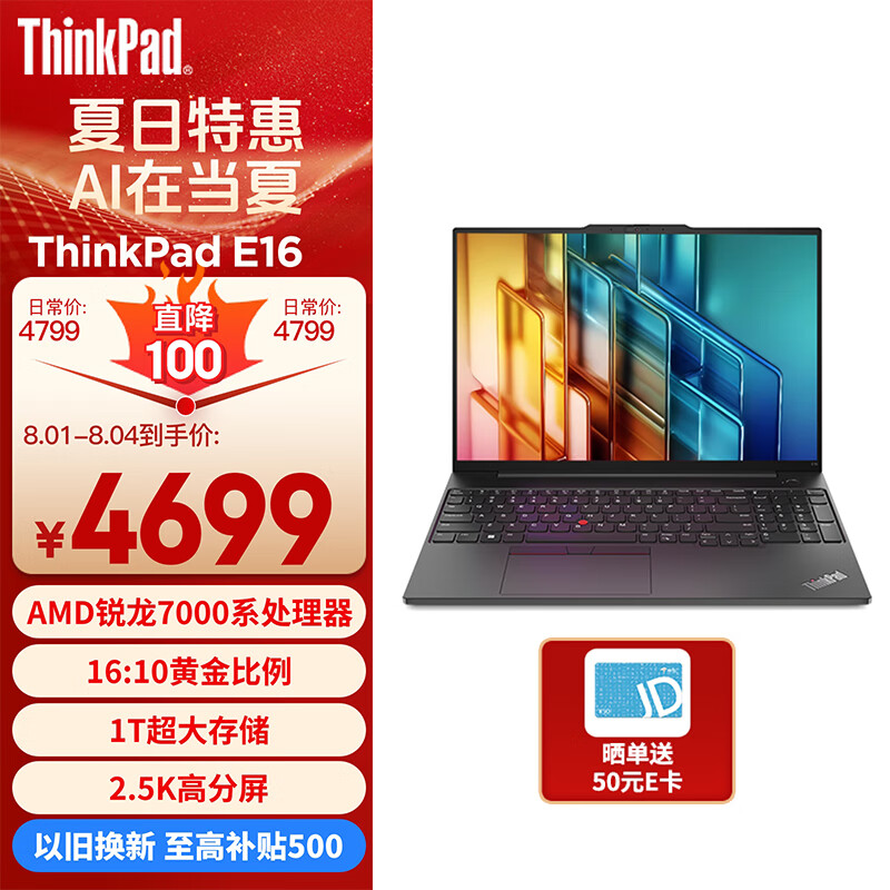 ThinkPad E16 16英寸轻薄大屏联想笔记本电脑 R5-7530U 16G 1T 2.5K 100%sRGB 黑 商务大屏 AI生态价格:4699.00元!