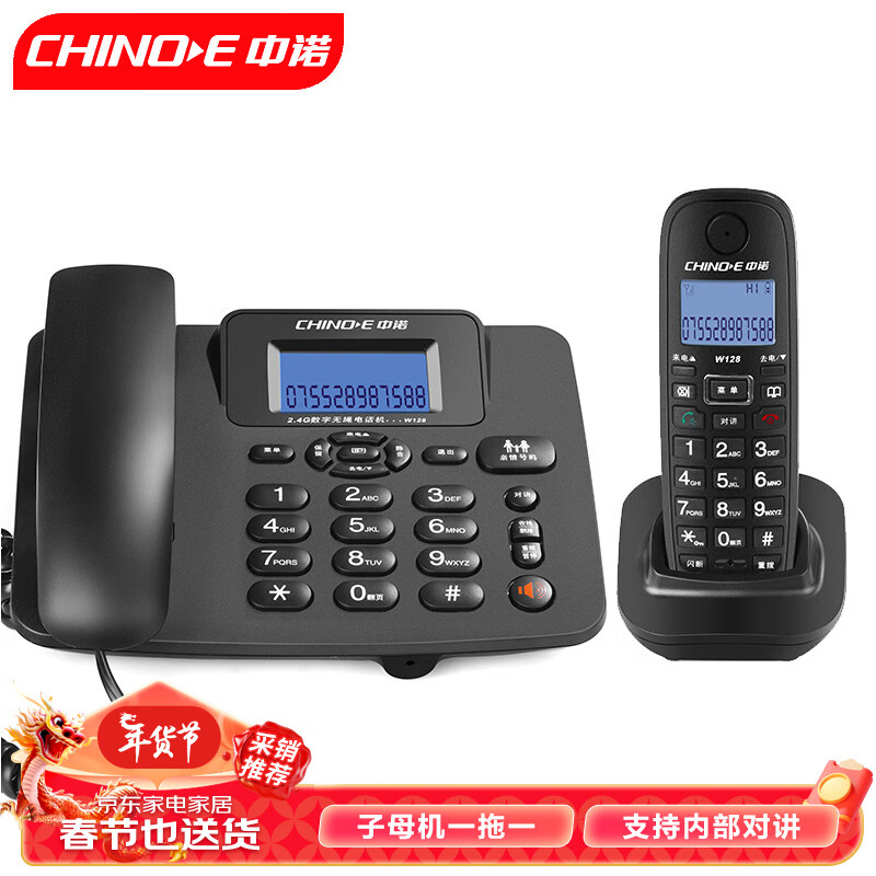 中诺数字无绳电话机无线座机子母机一拖一套装内线通话一键拨号固定电话W128黑色价格:199.00元!