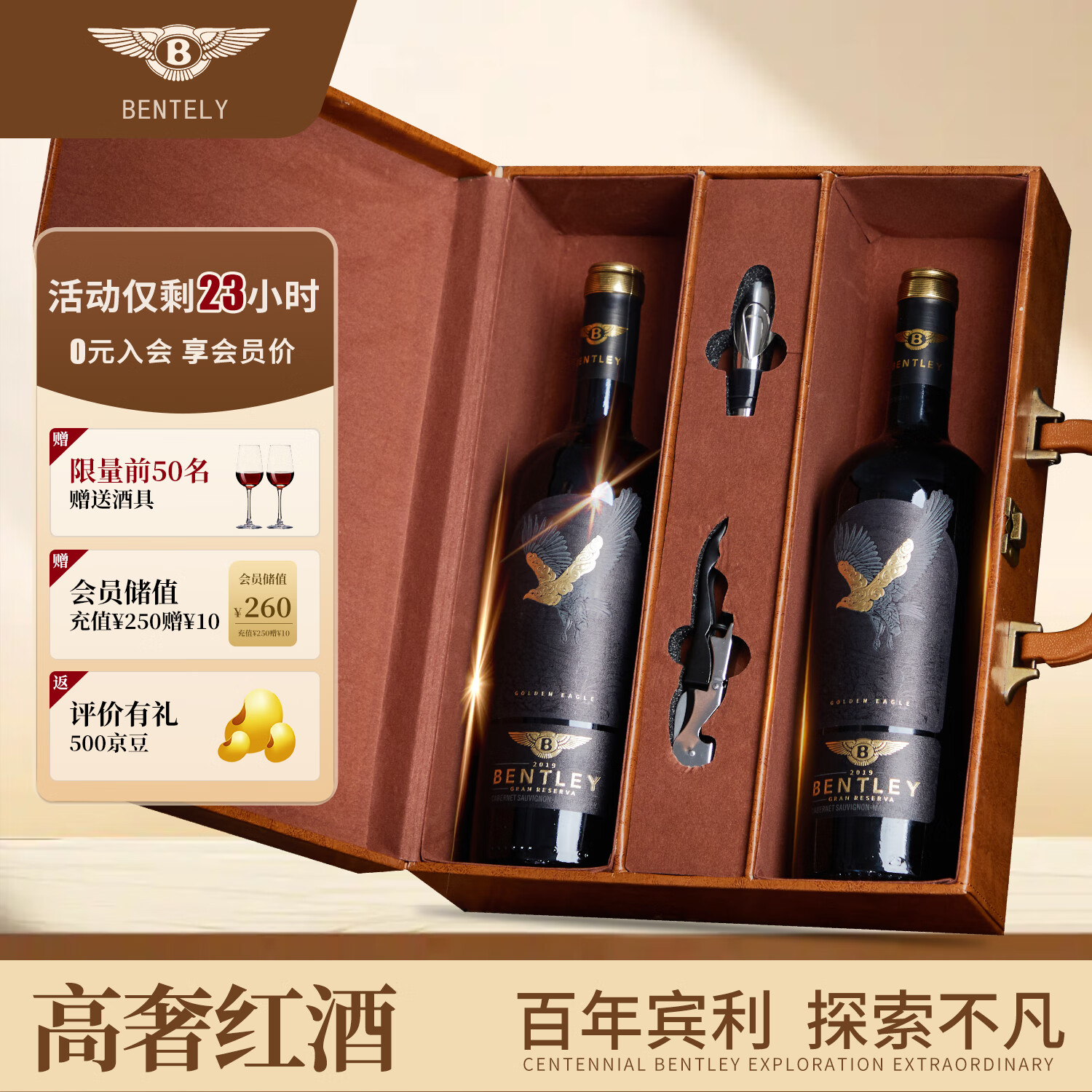 宾利(BENTLEY)智利原瓶进口红酒特级珍藏级干红葡萄酒750ml*2红酒礼盒双支送礼价格:598.00元!