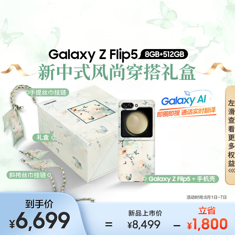 三星(SAMSUNG)Galaxy Z Flip5 AI手机 同声翻译 智能外屏 新中式风尚穿搭限定礼盒 8GB+512GB 星河白 折叠屏手机价格:6699.00元!