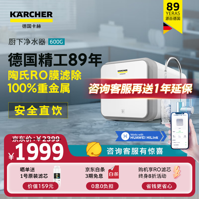 KARCHER德国卡赫净水器家用厨下式净水机直饮一体机接自来水陶氏RO反渗透过滤厨房专用净饮机 厨下600G价格:2399.00元!