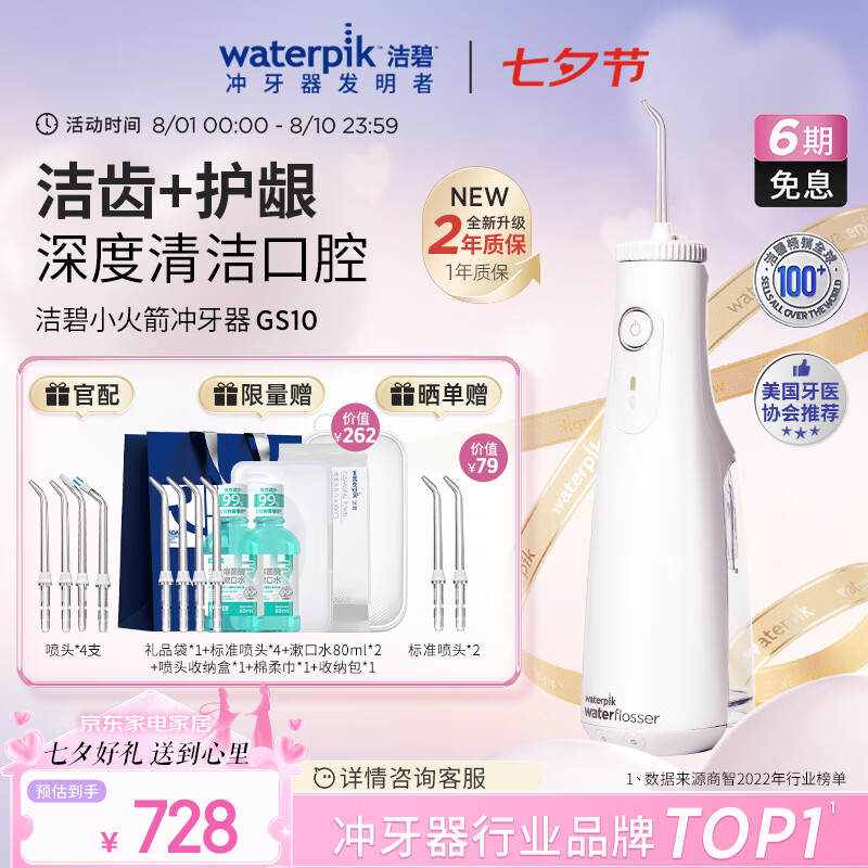洁碧(Waterpik)冲牙器便携式电动洗牙器水牙线家用立式预防牙结石正畸适用全身水洗【小火箭】【七夕情人节礼物】价格:808.00元!